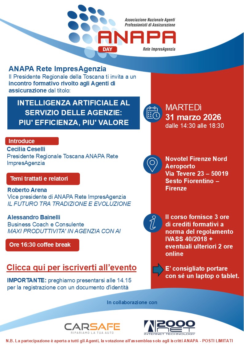 ANAPA DAY – Firenze, 31 marzo 2026 – INTELLIGENZA ARTIFICIALE AL SERVIZIO DELLE AGENZIE: PIU’ EFFICIENZA, PIU’ VALORE