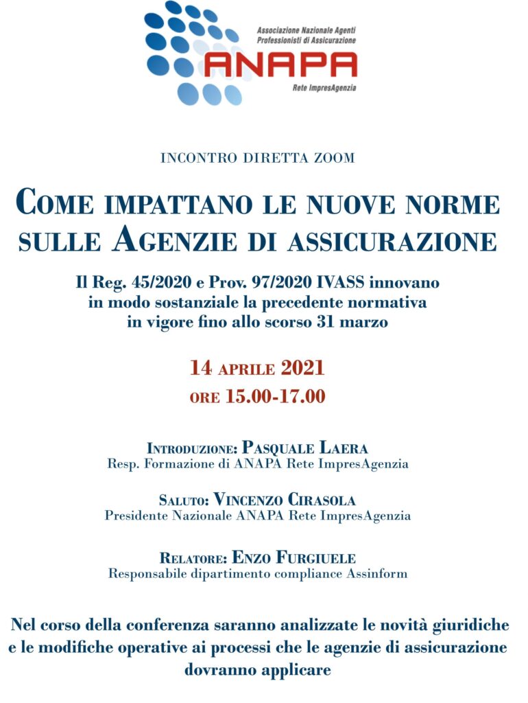 Come impattano le Nuove Norme sulle Agenzie di Assicurazione – Partecipa all’incontro online il 14 aprile 2021
