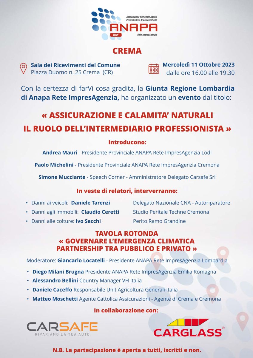 SAVE THE DATE 11-10-23 Anapa Day Crema – Assicurazione e calamità naturali Il ruolo dell’intermediario professionista