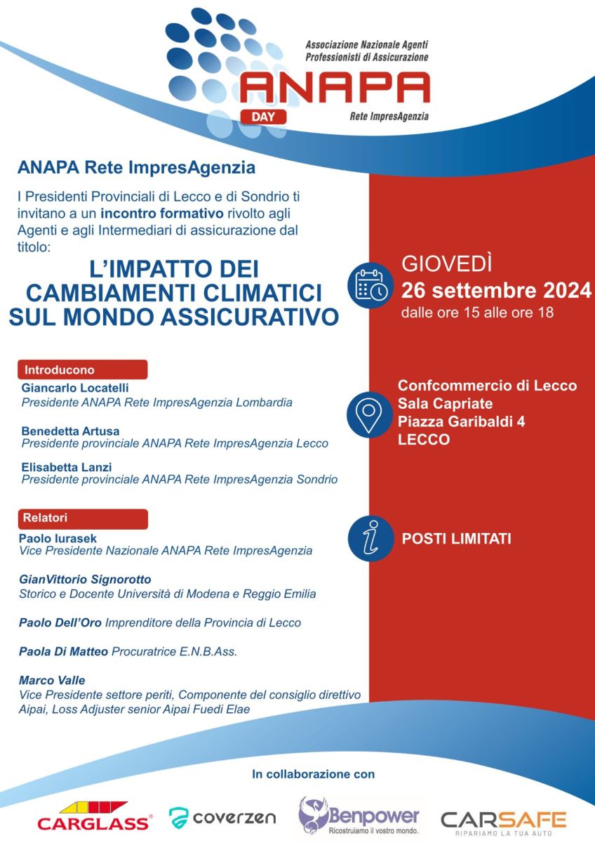 SAVE THE DATE 26-09-2024 Anapa day Lombardia – “L’ impatto dei cambiamenti climatici sul mondo assicurativo”