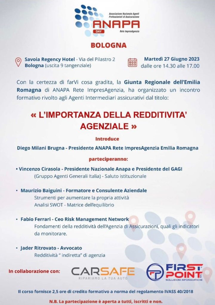 “L’importanza della redditività agenziale” è il titolo dell’evento formativo, aperto a tutti gli agenti di assicurazioni iscritti e non, organizzato dalla Giunta regionale Emilia Romagna di ANAPA Rete ImpresAgenzia, che si terrà martedì 27 giugno p.v. a Bologna, presso il “Savoia Regency Hotel”, in via del Pilastro 2 (h 14.30 – 17.00).